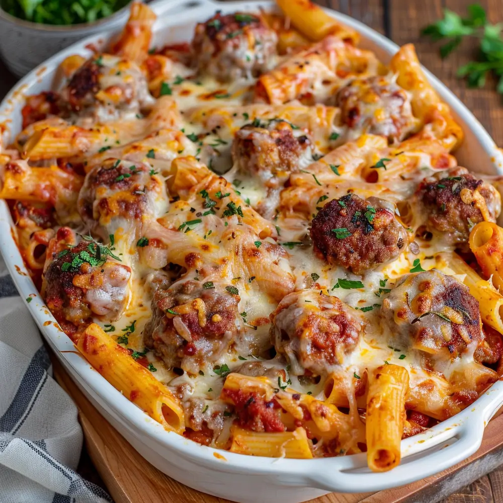 The base of this dish is ziti pasta – short, tube-shaped noodles that hold sauce beautifully. The pasta is cooked until just al dente, then tossed with marinara sauce and layered with meatballs and cheese. The meatballs are typically made from a blend of ground beef, pork, or a mix, seasoned with garlic, Parmesan, herbs, and breadcrumbs to keep them tender and flavorful.
