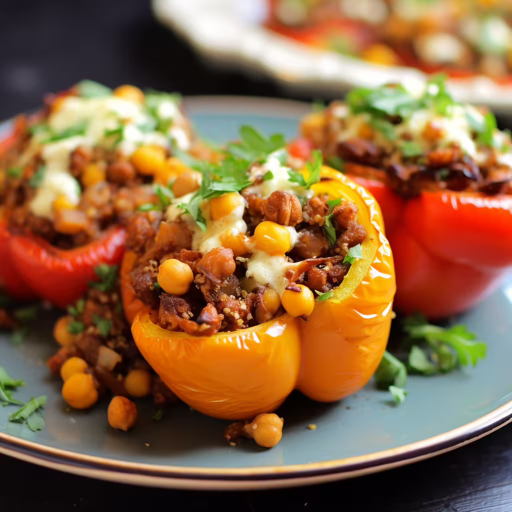 - Place the bell peppers in a baking dish and fill each one with the beef and chickpea mixture. Top with shredded cheddar cheese.