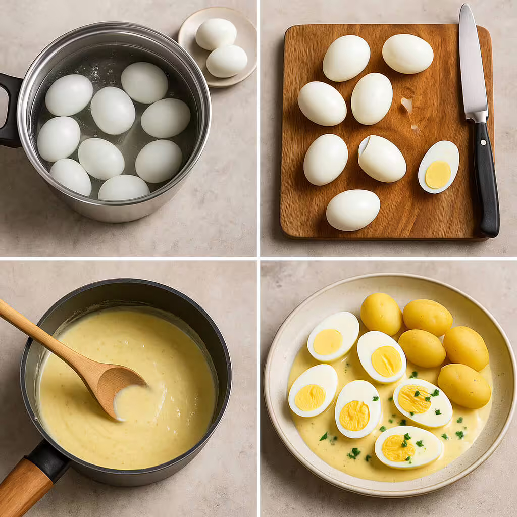 Boiled eggs in mustard sauce is a delightful dish that combines the creaminess of eggs with the zesty kick of mustard. This simple yet flavorful recipe is perfect for those looking to add a tangy twist to their usual boiled egg routine. With its rich sauce and perfectly cooked eggs, this dish makes for a satisfying snack, appetizer, or side dish, and can be enjoyed as part of a light meal or as a comforting accompaniment to a larger spread.