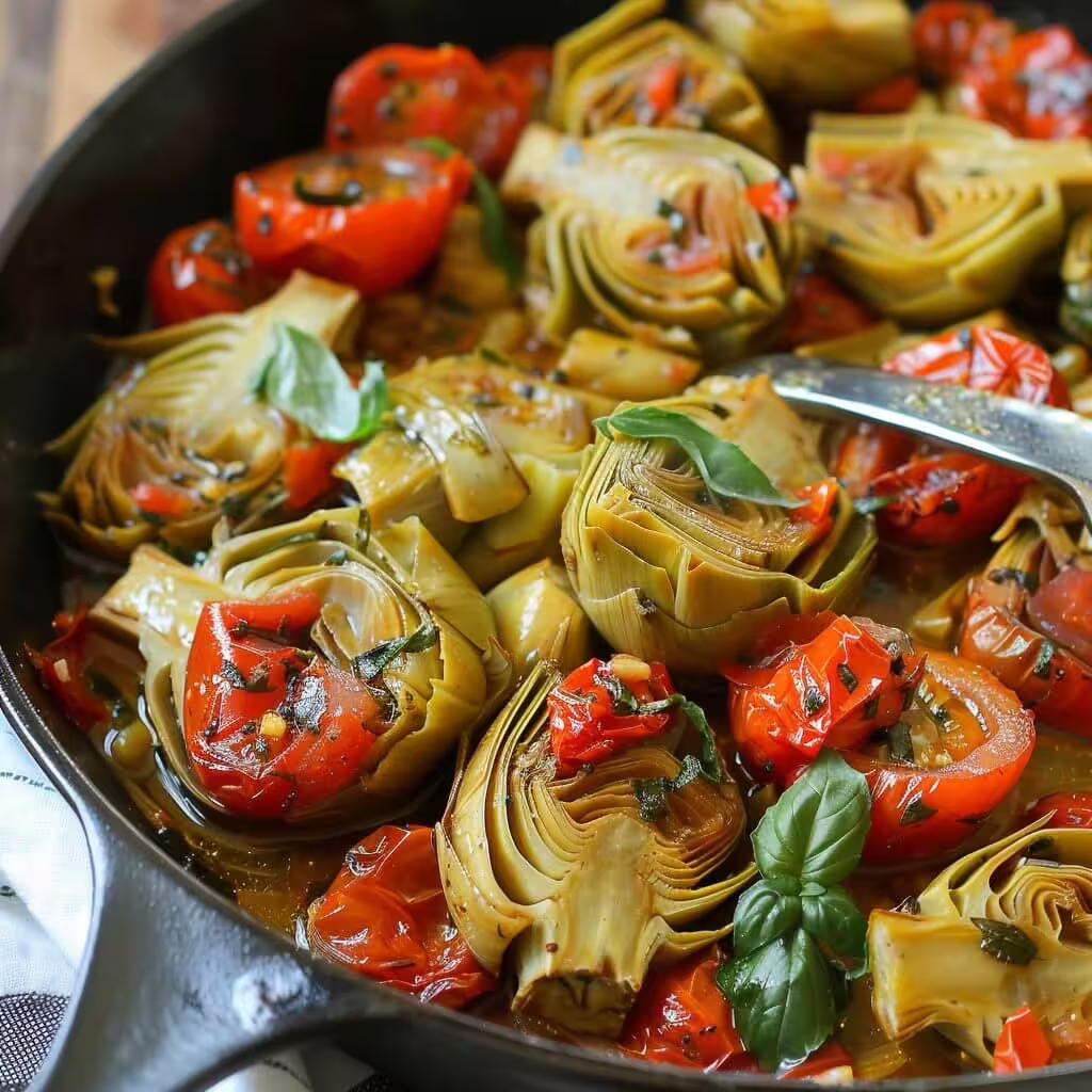 The dish begins with baby artichokes, cleaned and halved, then gently browned to build flavor. Next comes a fragrant base of garlic and onion, followed by juicy tomatoes that simmer down into a light sauce. A generous handful of fresh basil is stirred in at the end, bringing a bright herbal finish that balances the richness of the braise.
