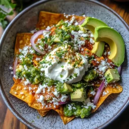 Classic Mexican breakfast dish made from tortilla chips simmered in a salsa (green or red), topped with cheese, sour cream, onions, cilantro, and often fried eggs or shredded chicken.