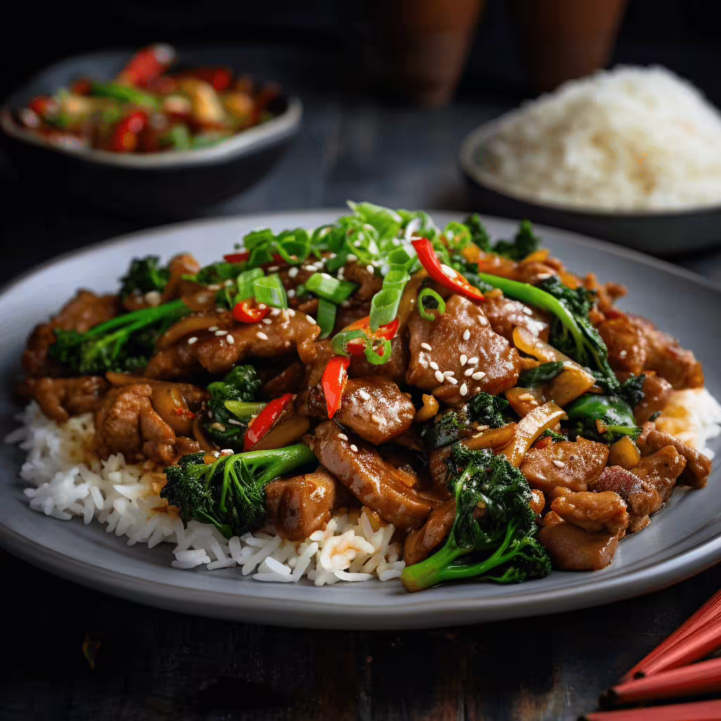- Serve the Crispy Garlic Pork Stir-Fry over steamed rice and garnish with sliced green onions and a sprinkle of sesame seeds.