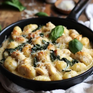 Once the sauce is ready, the cooked gnocchi, chicken, and spinach are added to the pan, and everything is gently tossed together to ensure the gnocchi is coated in the creamy sauce. The result is a beautifully balanced dish that combines the delicate, pillowy gnocchi with the tender chicken, fresh spinach, and a rich, cheesy sauce.