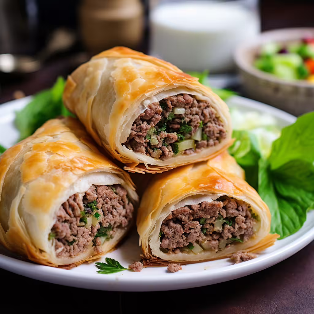 Lebanese Beef Sambousek are savory pastries filled with spiced ground beef, wrapped in delicate, flaky dough. These delicious little pockets are a popular appetizer or snack in Lebanese cuisine, often served during festive occasions or as part of a mezze spread. Their crispy, golden exterior and flavorful filling make them an irresistible treat.