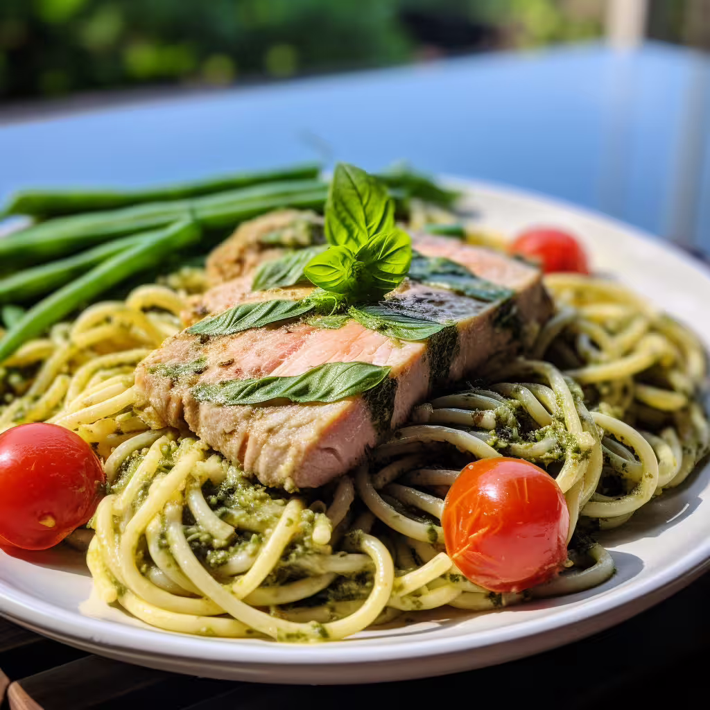 The star of the dish is the grilled tuna. Fresh tuna steaks are seasoned simply with salt, pepper, and a touch of olive oil before being grilled to your preferred doneness. The tuna adds a smoky, meaty element to the dish, offering a rich contrast to the fresh, herbaceous pesto. Grilling the tuna enhances its natural flavor, giving it a slightly charred exterior and a tender, juicy interior.