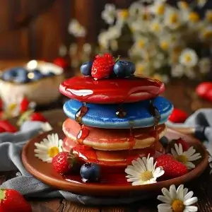 The red comes from sweet, juicy strawberries or raspberries, sliced and layered between pancakes or sprinkled generously on top. Blueberries add a burst of juicy flavor and bring that classic blue to the dish, offering both color and a healthy dose of antioxidants. The “white” is in the pillowy soft pancakes themselves and can be highlighted with whipped cream, vanilla yogurt, or a dusting of powdered sugar.