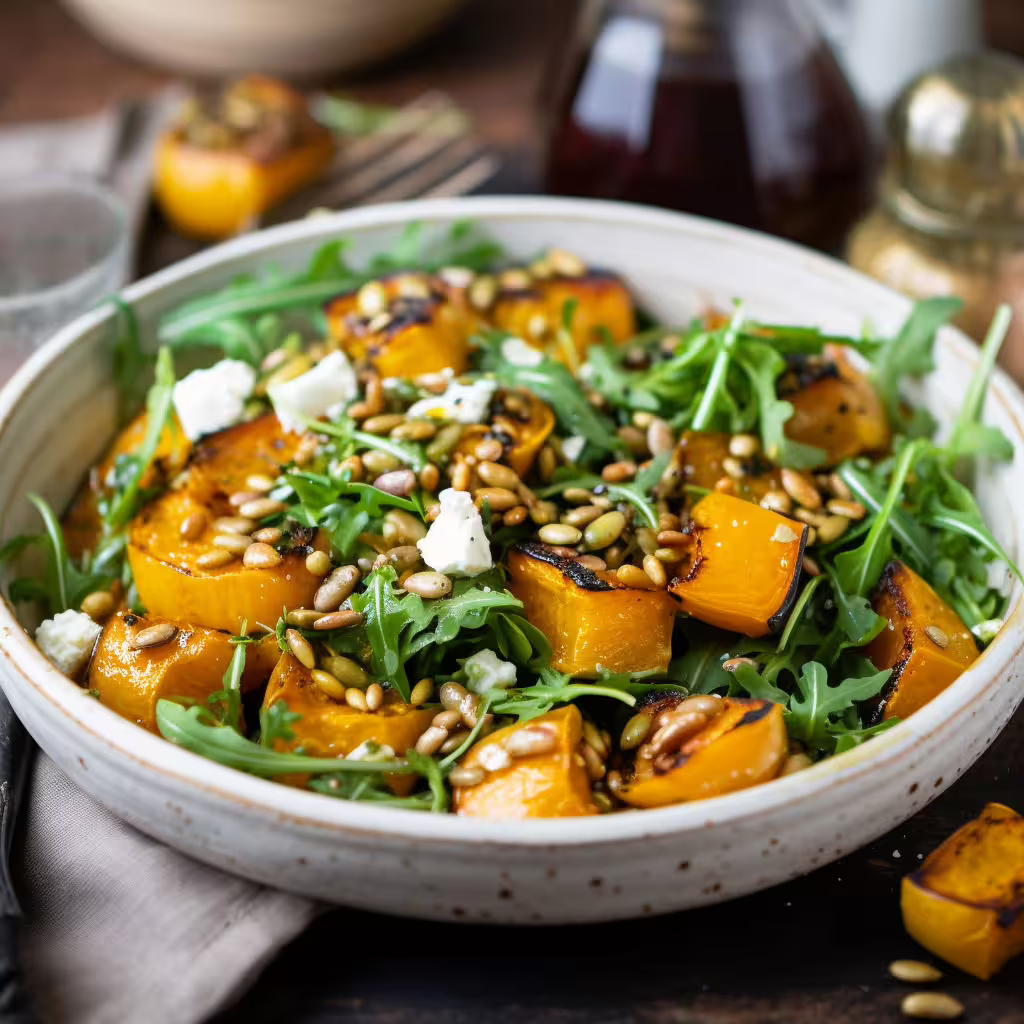 To complement the warm pumpkin, toss it with fresh leafy greens like arugula, spinach, or mixed baby lettuce. Add crumbled feta or goat cheese for a creamy, tangy contrast, and a handful of toasted walnuts, pecans, or pumpkin seeds for crunch and depth. For extra color and nutrition, you can also mix in sliced red onion, pomegranate seeds, or roasted chickpeas.
