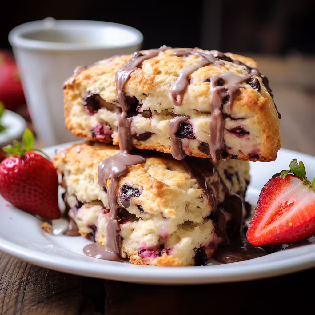 The base of this recipe is a traditional scone dough made with cold butter, flour, and just enough cream to bring everything together. The magic happens when you fold in chunks of fresh strawberries and a handful of semi-sweet chocolate chips. The strawberries add juicy bursts of flavor, while the chocolate melts into little pools of richness, making each bite feel like dessert.