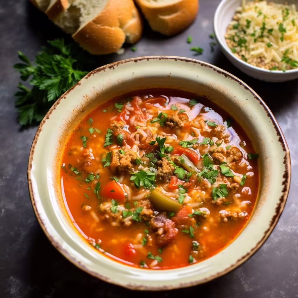 This soup begins by sautéing ground meat with onions and garlic until browned and fragrant. Chopped green and red bell peppers are then added, providing a slight sweetness and crunch that mirrors the classic dish. The base is built with crushed tomatoes, tomato sauce, broth, and a touch of Italian seasoning, creating a robust and flavorful foundation. Cooked rice is stirred in toward the end to soak up the delicious broth and add substance.
