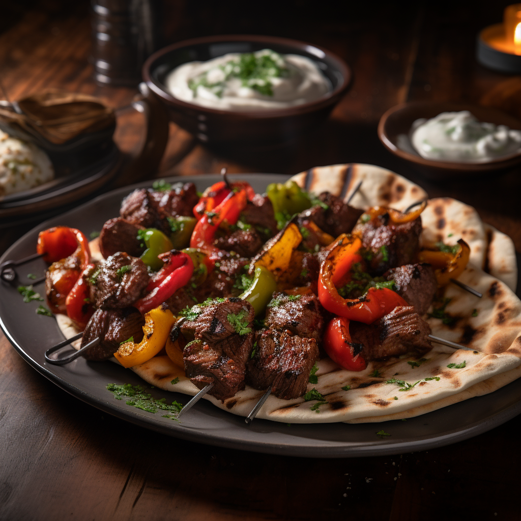 3.69 Facebook Twitter Pinterest Yummly WhatsApp Breakfast Recipe Grilled Beef and Pepper Skewers with Pita