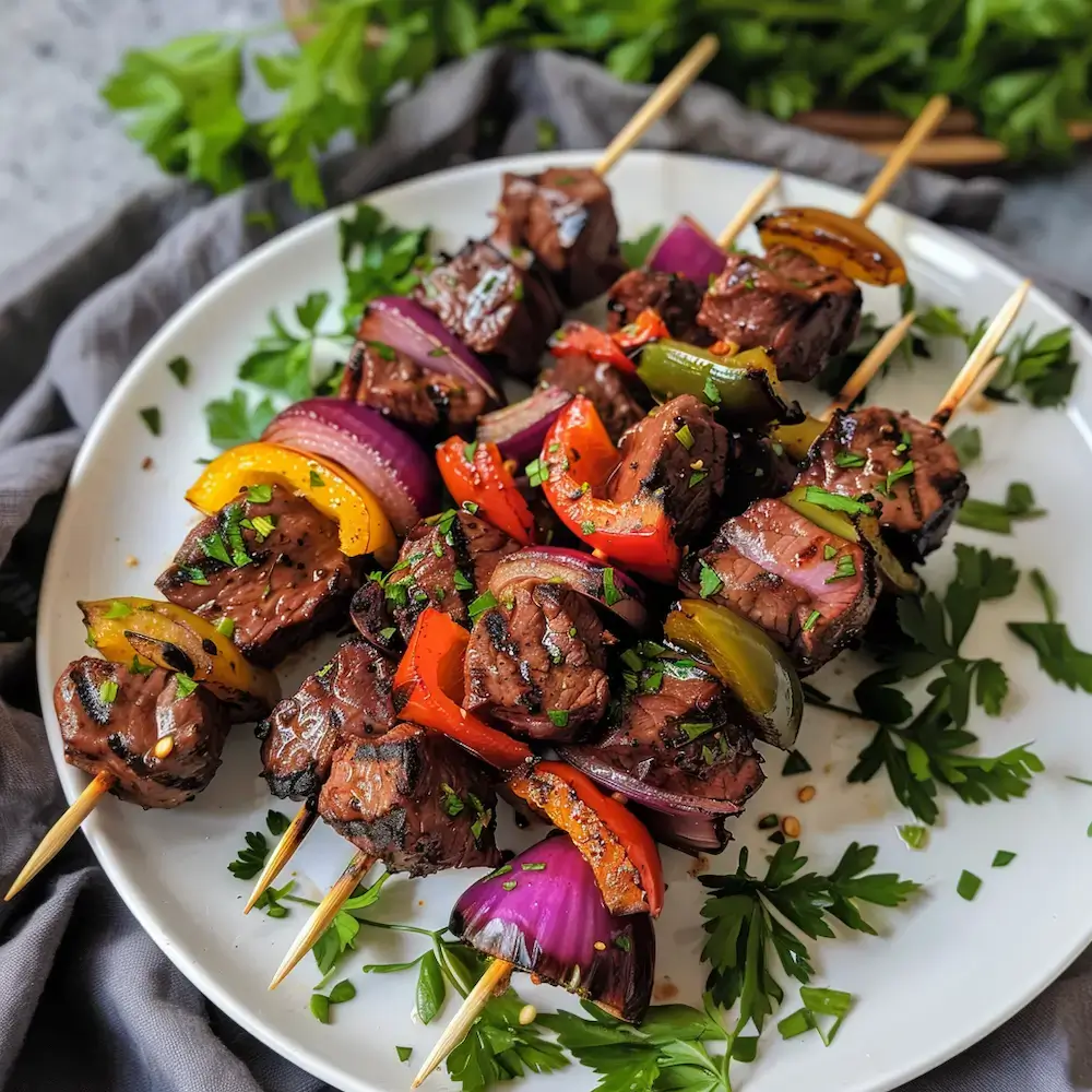 3.63 Facebook Twitter Pinterest Yummly WhatsApp Brunch Recipe Grilled Beef Skewers with Bell Peppers and Onions