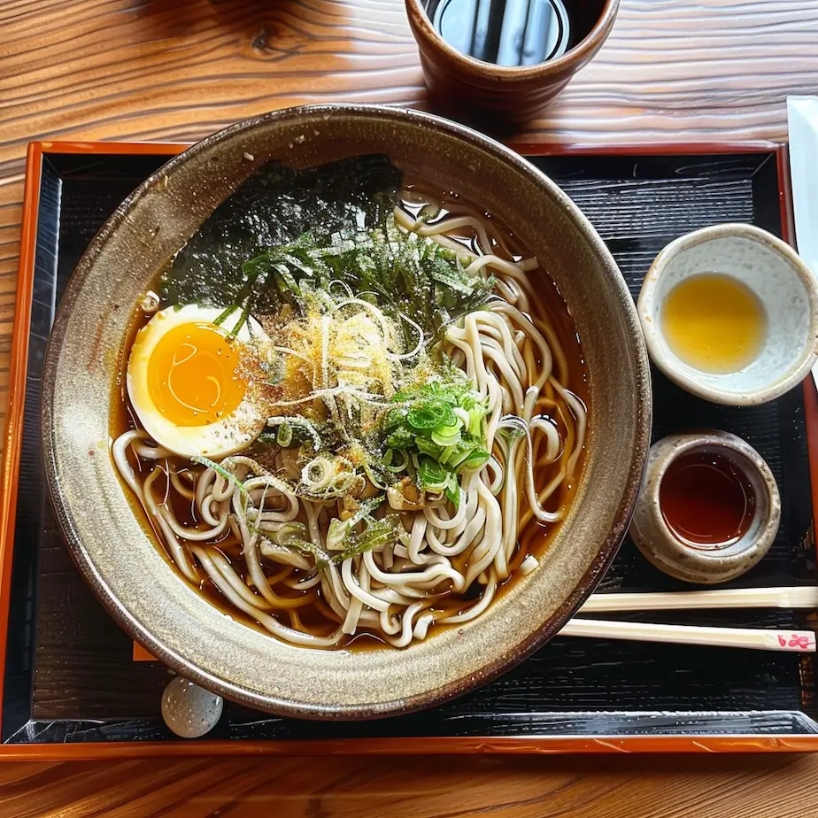 - Top the noodles with chopped green onions, bean sprouts, shredded nori, toasted sesame seeds, and sliced soft boiled egg.