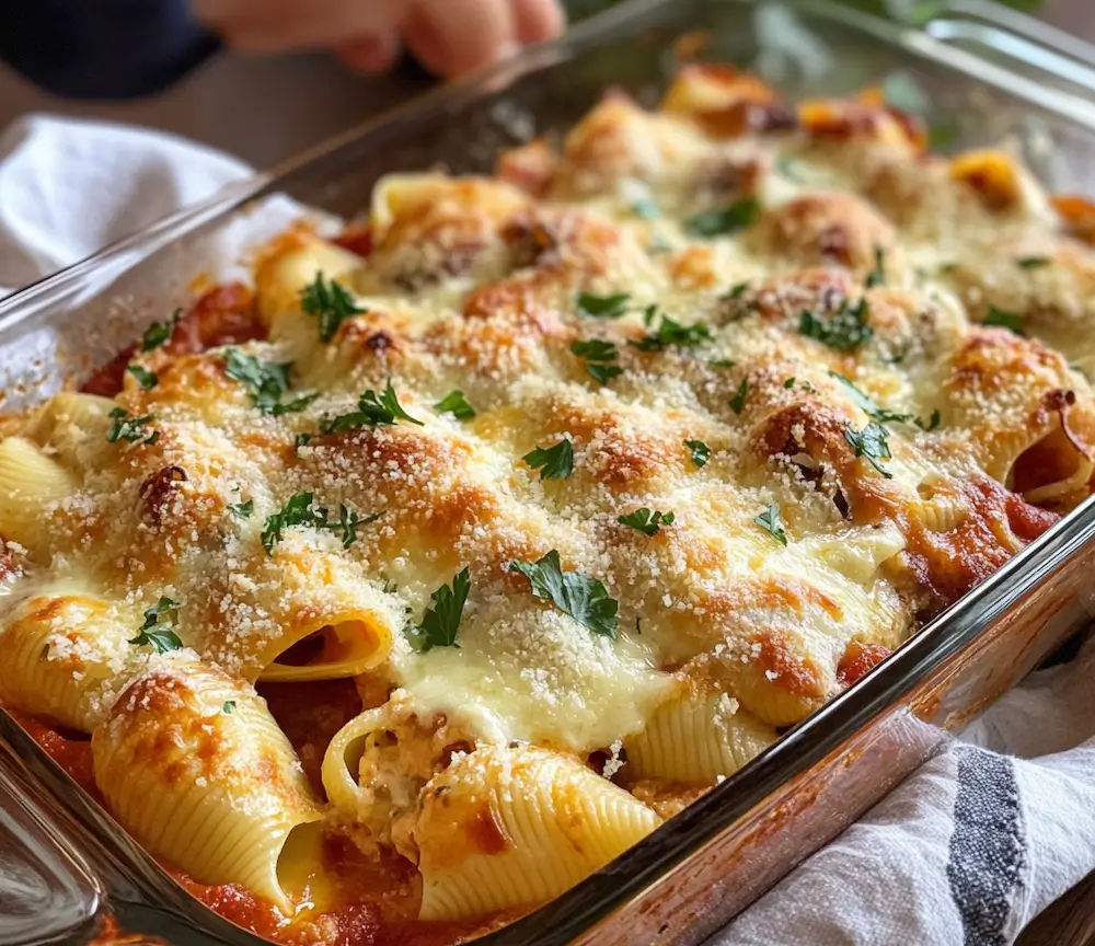 Once the shells are stuffed, they’re arranged in a baking dish and smothered with marinara sauce. The sauce adds a tangy, slightly sweet contrast to the rich cheese filling and helps to keep the pasta shells moist during baking. A generous sprinkle of shredded mozzarella and Parmesan cheese on top creates a golden, bubbly crust as the dish bakes in the oven.