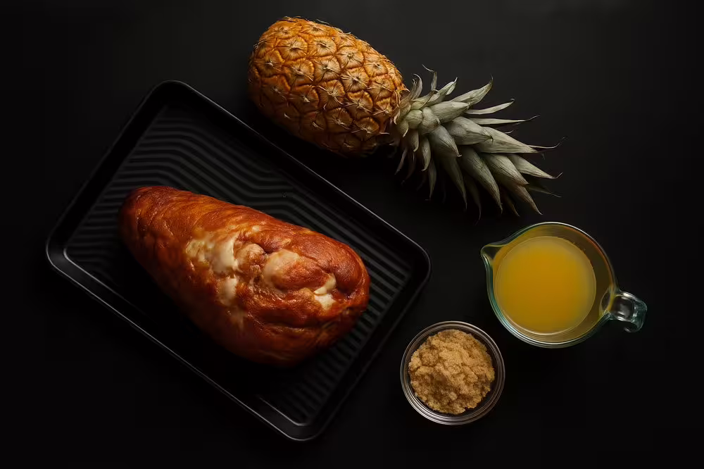 ![Ingredients for brown sugar and pineapple glazed ham, including smoked pork shoulder, whole pineapple, pineapple juice, and brown sugar, arranged on a table.]()