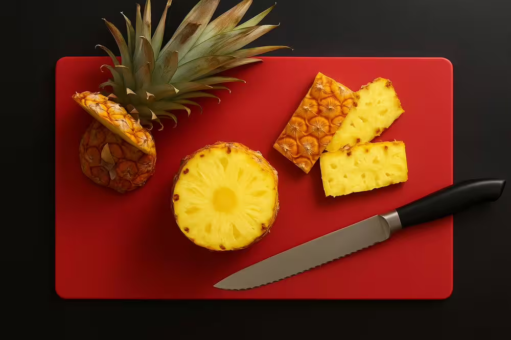 - Trim the pineapple by cutting off the skin and removing any remaining brown eyes. Slice it into 1/2-inch rings, core each ring, and prepare them for pinning onto the ham with toothpicks