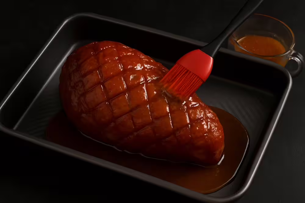 - Spread the glaze over the ham, pressing the mixture into the cuts.