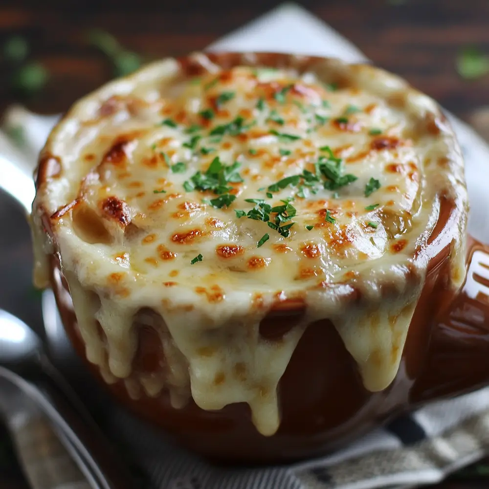 What makes Cheesy French Onion Soup so special is the combination of textures. The soup itself is rich and savory, the onions tender and sweet, while the bread adds a satisfying crunch. As you dig into the soup, the melted cheese stretches with each spoonful, adding a creamy, indulgent layer to the dish.