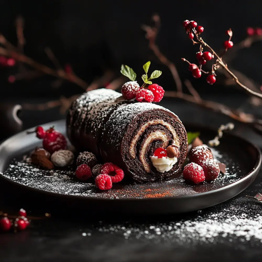 The rolled cake is typically dusted with powdered sugar, giving it an elegant finish, or you can drizzle it with extra ganache or a dusting of cocoa powder for a more decadent look. It’s a dessert that’s visually striking yet surprisingly easy to make once you get the hang of rolling the cake.