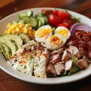 The dressing is usually a simple vinaigrette, often made with red wine vinegar, olive oil, mustard, and a touch of garlic, which ties all the ingredients together. The combination of creamy, tangy, and savory flavors makes every bite of the Cobb Salad a delightful experience.