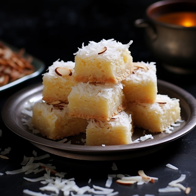Visually, coconut barfi often looks like little squares of edible snow. It’s common to find it cut into neat diamonds or rectangles, sometimes topped with slivered almonds or silver leaf for a festive flair. But even without the extra garnish, the texture alone makes it feel special – slightly crumbly on the outside and delightfully soft on the inside.