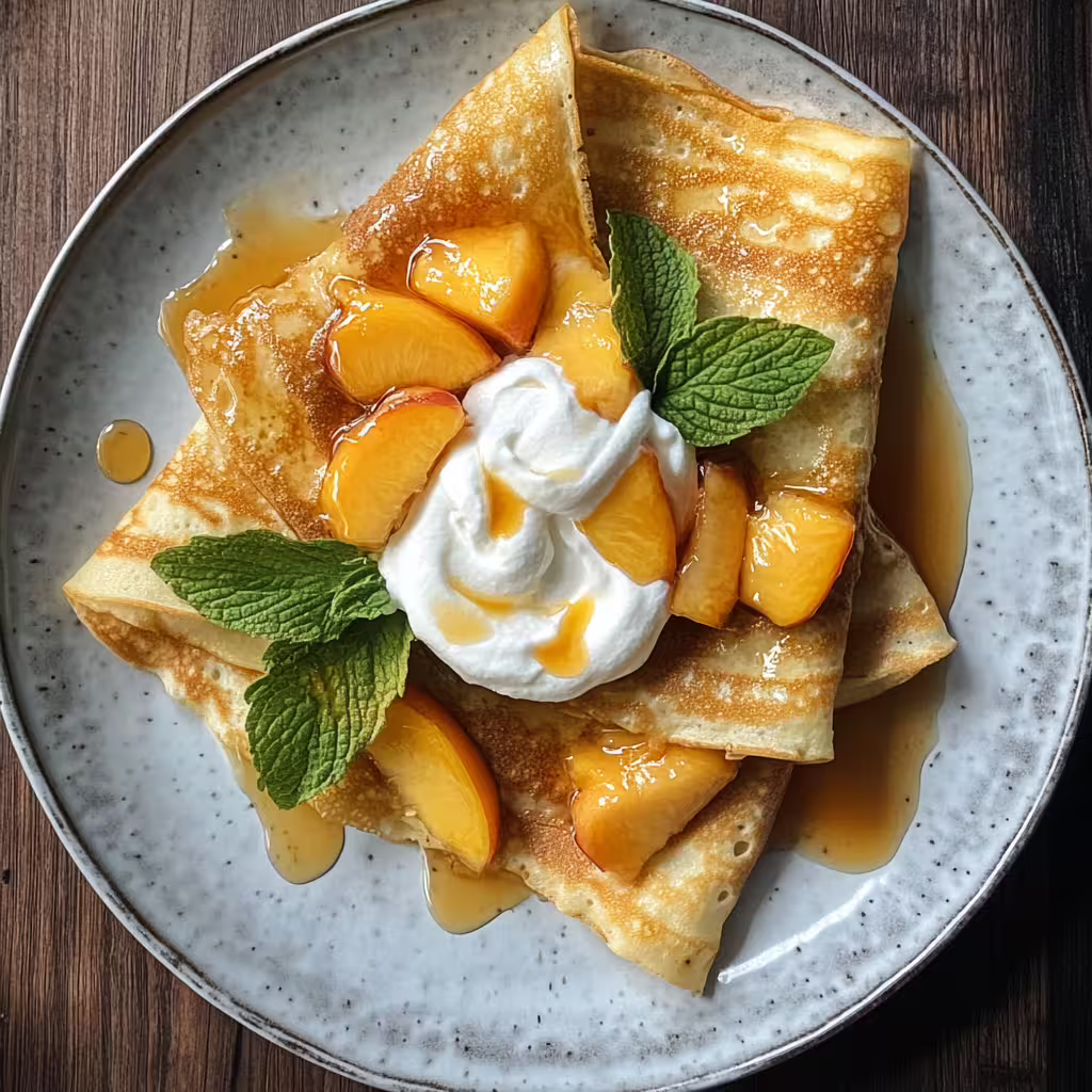 - To serve, fill each crepe with peach compote, fold, and top with whipped cream.