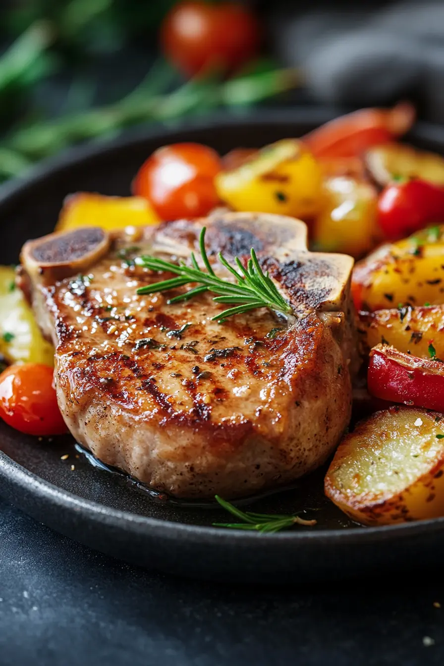 - Transfer the pork chops, vegetables, and potatoes to a serving dish.