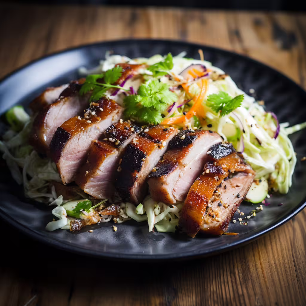 - Serve the grilled pork belly on top of the cabbage salad. Enjoy!