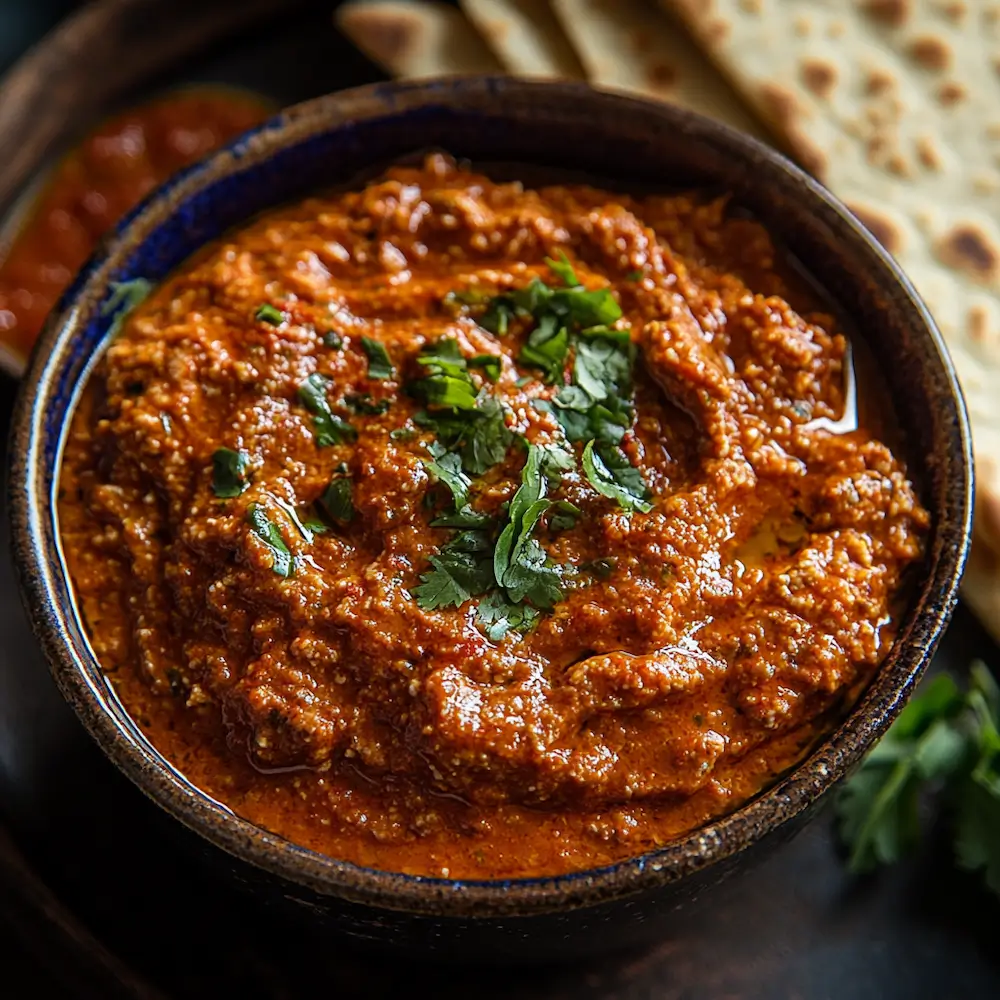 Muhammara is a vibrant, flavorful spread that hails from Syria, offering a delicious combination of smoky, sweet, and spicy notes. This traditional Middle Eastern dip is made primarily from roasted red peppers, walnuts, and olive oil, creating a rich and creamy texture that is perfect for dipping or spreading on bread, crackers, or veggies.