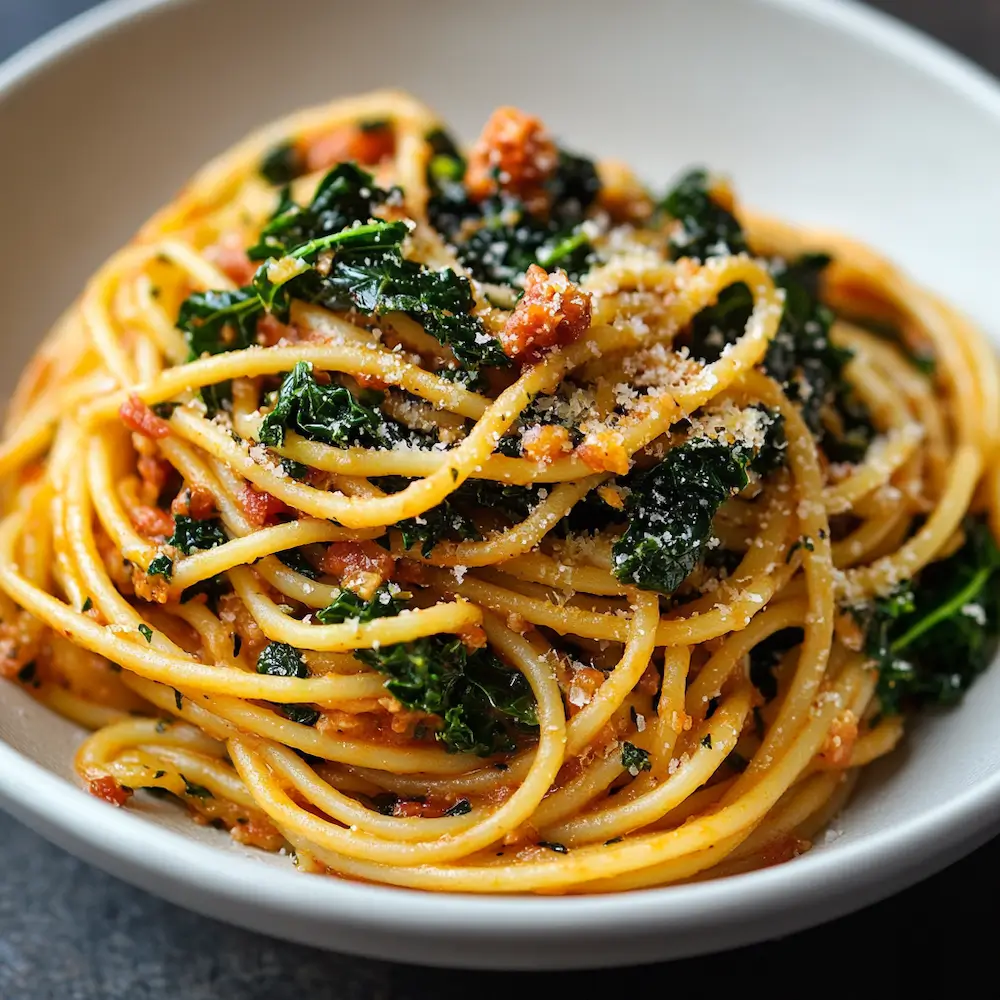 Kale, with its hearty texture and earthy taste, adds a nutritious and flavorful twist to classic spaghetti. As it cooks down, it becomes tender and slightly sweet, pairing perfectly with the pasta. Garlic, onions, and a splash of olive oil often form the aromatic base of the dish, giving it depth and a rich, savory aroma. Some versions might include crushed red pepper for a bit of heat, lemon juice for brightness, or a sprinkle of grated cheese to tie everything together with a creamy, salty finish.