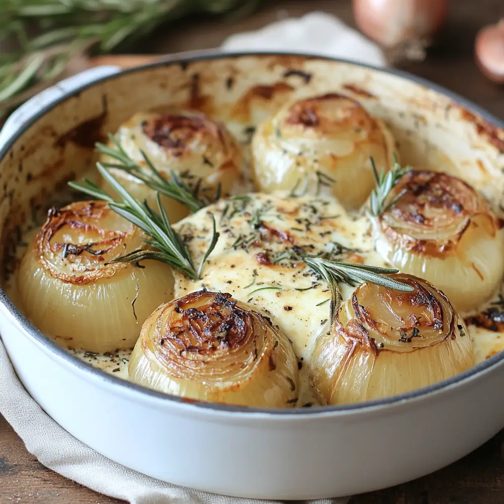 Onions baked with rosemary and cream is a luxurious yet simple side dish that transforms humble onions into something rich, savory, and deeply flavorful. Slow-baked until tender and caramelized, the onions develop a natural sweetness that pairs beautifully with the earthy aroma of rosemary and the indulgent richness of cream.
