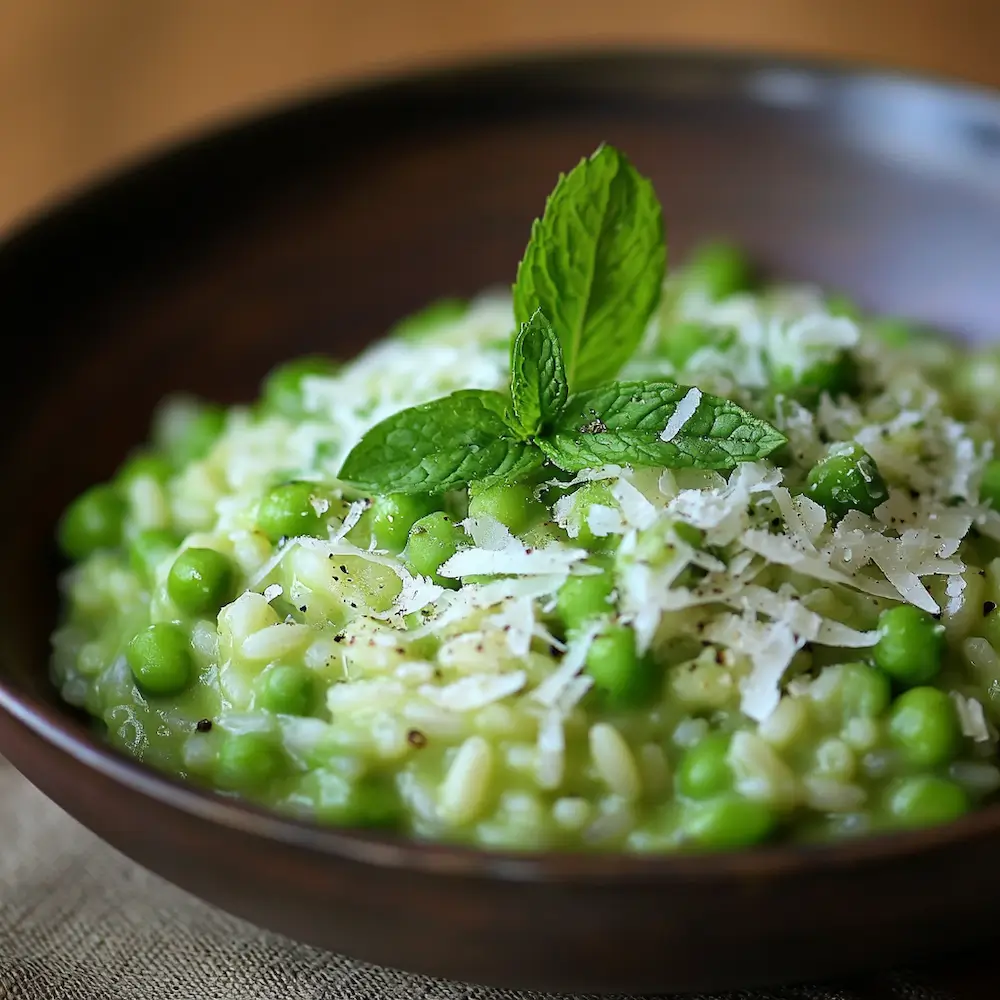 The base of the risotto is made using Arborio rice, which slowly releases its starch as it’s stirred, creating a naturally rich and velvety texture without needing heavy cream. The peas, added near the end of cooking, provide a tender bite and delicate sweetness that balances the richness of the rice. Fresh mint is stirred in just before serving, lifting the flavor with its herbal brightness and turning the dish into something that feels garden-fresh and modern.