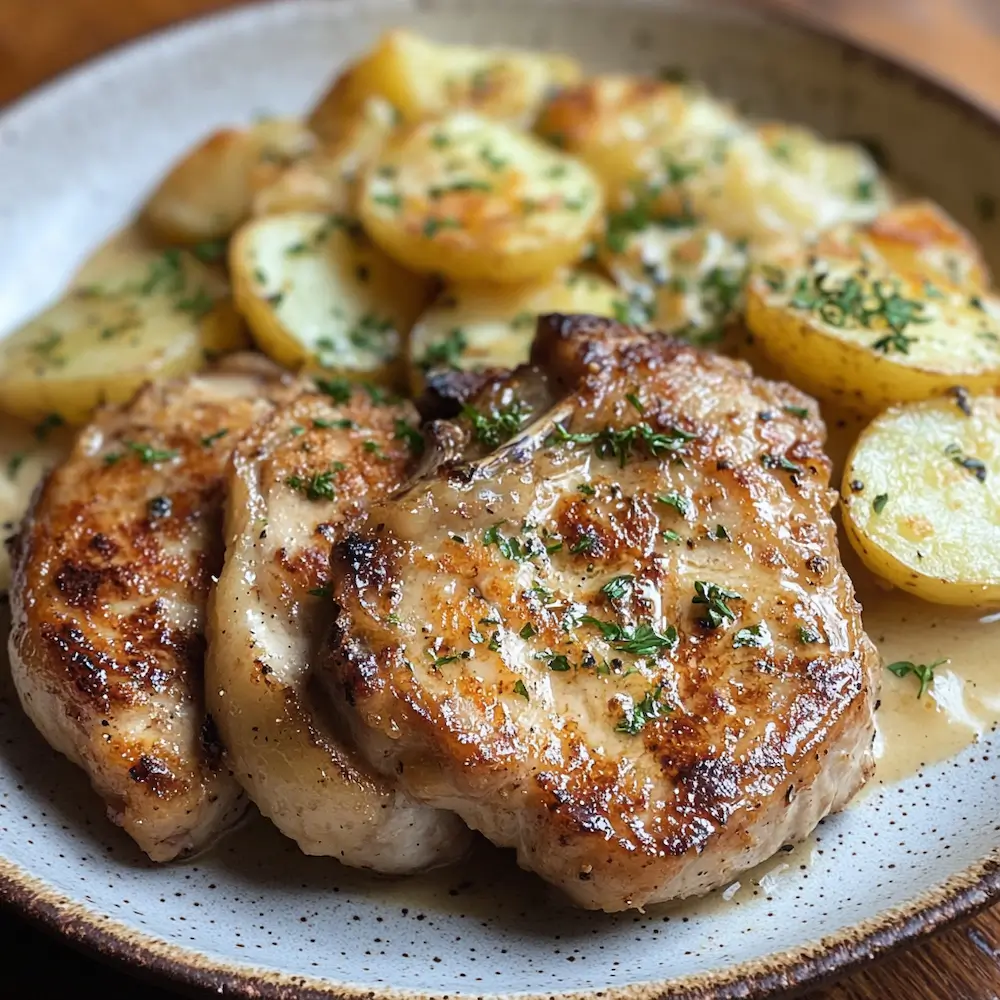 While the scalloped potatoes are baking, prepare the pork chops. Whether you choose bone-in or boneless pork chops, they are seared in a hot pan to achieve a beautiful golden-brown crust. The pork chops can be seasoned simply with salt, pepper, and herbs like thyme or rosemary, or you can marinate them for extra flavor. Once seared, they’re finished off in the oven to ensure they’re perfectly cooked through, juicy, and tender.