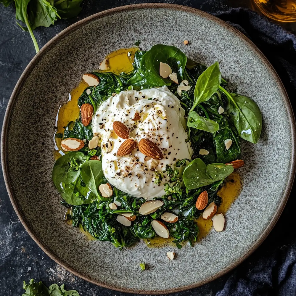 The addition of toasted almonds introduces a satisfying crunch, complementing the creaminess of the burrata and the tender spinach. The nuts also add a subtle, nutty flavor that enhances the overall taste, making each forkful a perfect balance of creamy, crunchy, and savory.