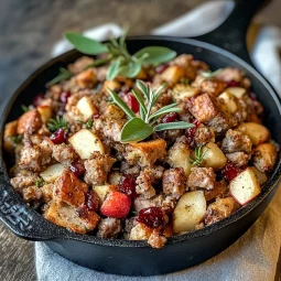 Sausage, apple, and cranberry stuffing is a savory and slightly sweet twist on classic stuffing that brings incredible flavor and texture to any holiday table. It perfectly balances the richness of savory sausage with the sweetness of apples and the tart pop of dried cranberries, creating a dish that’s hearty, satisfying, and full of fall flavors.