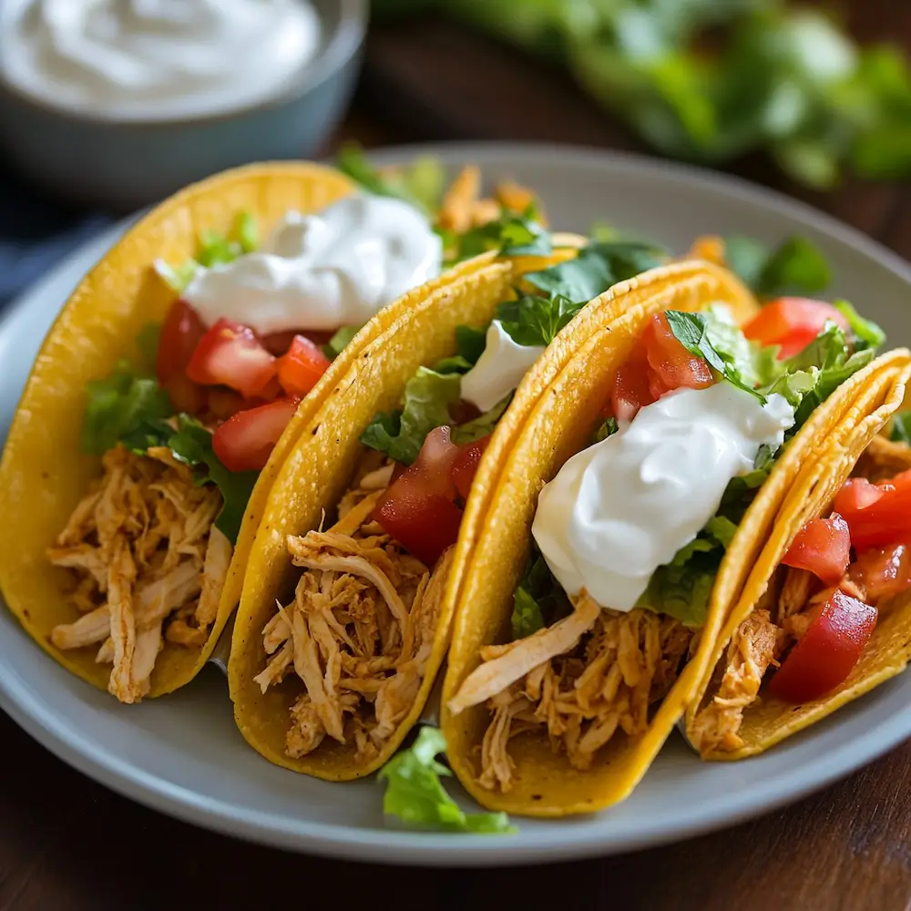 - Fill each taco shell with shredded chicken, then top with lettuce, cheese, tomatoes, and sour cream.