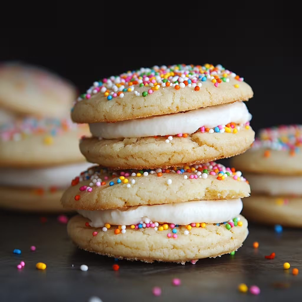 Once the cookies have cooled completely, spread a generous amount of filling onto the flat side of one cookie. Top it with another cookie, pressing gently to sandwich them together. If desired, roll the edges of the sandwich in sprinkles or colorful sugar for a festive touch.