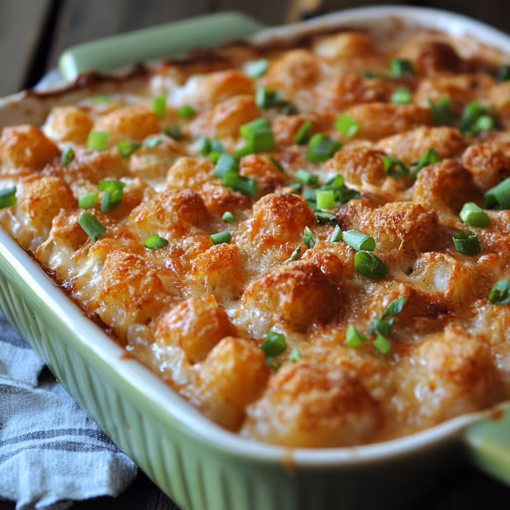 Bake the casserole in a preheated oven at 375°F (190°C) for 25–30 minutes or until the tater tots are golden brown and crispy. For an extra cheesy version, sprinkle shredded cheddar cheese over the top during the last 10 minutes of baking and return it to the oven until melted and bubbly.