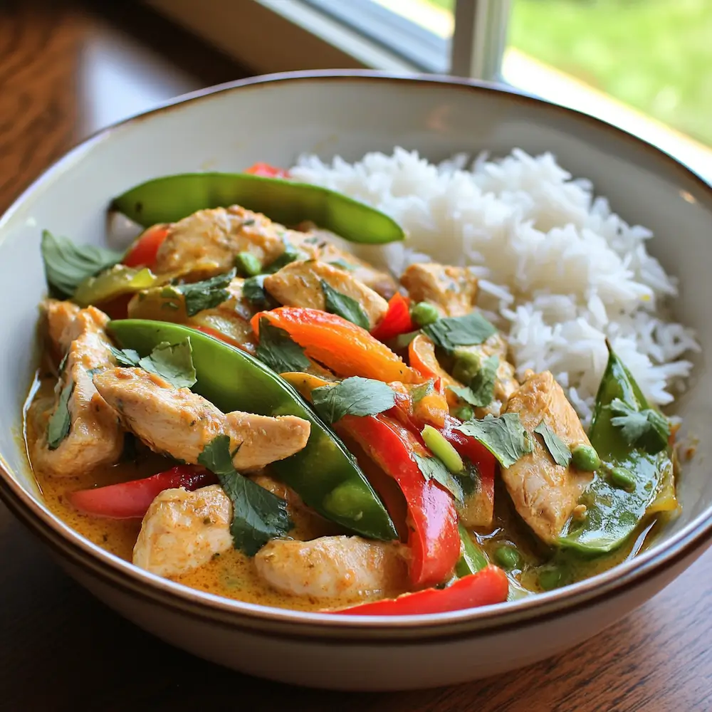 Boneless, skinless chicken thighs or breasts are simmered in the sauce, absorbing all the flavors and becoming tender and juicy. To enhance the dish, vegetables like bell peppers, carrots, and zucchini can be added, adding both color and texture to the curry. Fresh cilantro, basil, or lime juice is often stirred in towards the end to brighten the flavors and add a touch of freshness.