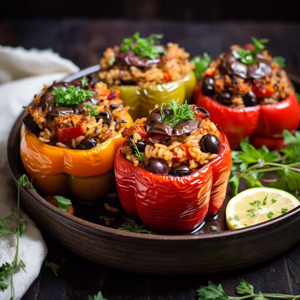 At the heart of this recipe are bell peppers, which act as edible vessels for a savory filling of fluffy rice, briny olives, and aromatic herbs. When baked, the peppers become soft and sweet, perfectly balancing the salty and herby stuffing. The combination of Kalamata olives, fresh dill, parsley, and a splash of lemon juice gives the dish a distinctly Greek flavor profile. It’s vibrant and zesty, but still comforting and wholesome.