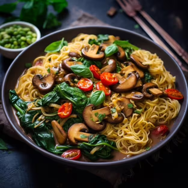 This vegan recipe is packed with incredible flavors. The combination of aromatic Thai curry paste, creamy coconut milk, and an assortment of fresh vegetables creates a well-balanced and satisfying dish. The noodles absorb the curry sauce, ensuring that every bite is bursting with flavor.