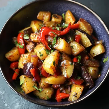 Facebook Twitter Pinterest Yummly WhatsApp Recipe Snacks & Appetizers Stir-fried Eggplant, Potatoes and Peppers