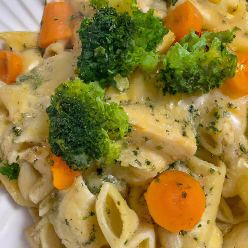 - Once the chicken is cooked, add the cooked pasta, steamed broccoli, and carrots into the skillet.