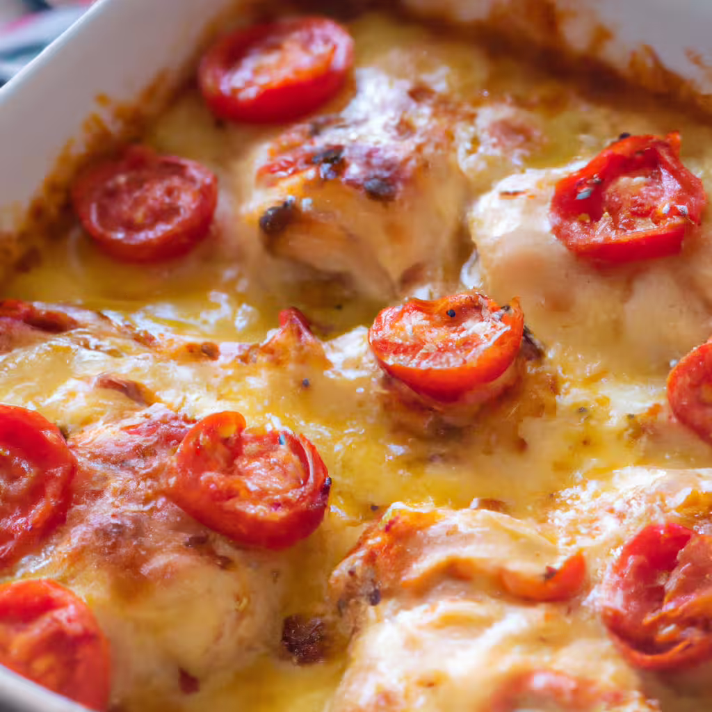 - Serve warm and enjoy your Cheesy Tomato Chicken Bake!